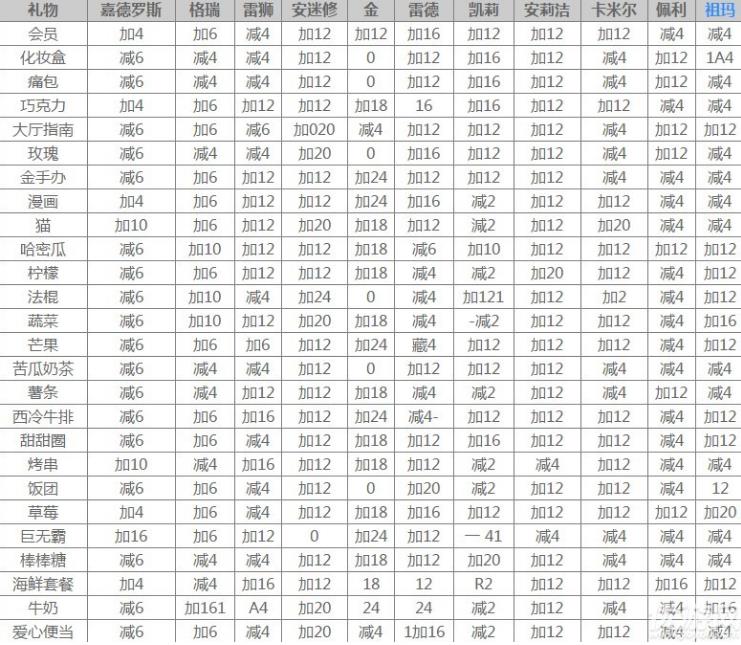 凹凸世界全角色礼物提升好感度数值图表: