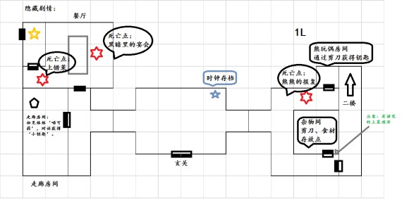 离开走廊房间,对上方餐厅门使用小钥匙可以开锁。餐厅开启后可以在杂物间取得食材,在杂物间门口处得知上菜顺序。按照一定次序将食材放到餐桌的盘子和篮子里,随后可以在餐厅门口触发剧情。