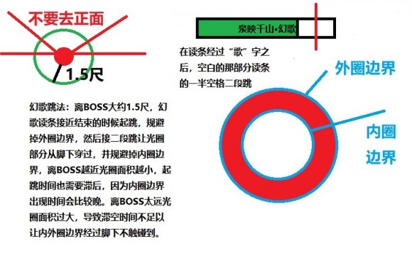 BOSS背后1.5尺左右抱团,读条快结束的时候二段跳起滞空,只需要躲开内外两个圈的边界即可,每吃到一次光圈,叠加4层减疗,每层5%。20层100%减疗。幻歌内圈伤害极低,目前无需到6尺之外卡距离。