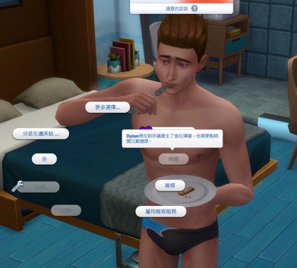 按摩控制——灵巧技能6级可以进行,需要四个通用升级部件,可以让小人在床上睡觉的时候精力恢复速度更快。终于可以使用那些精力恢复超慢的好看的床铺了!