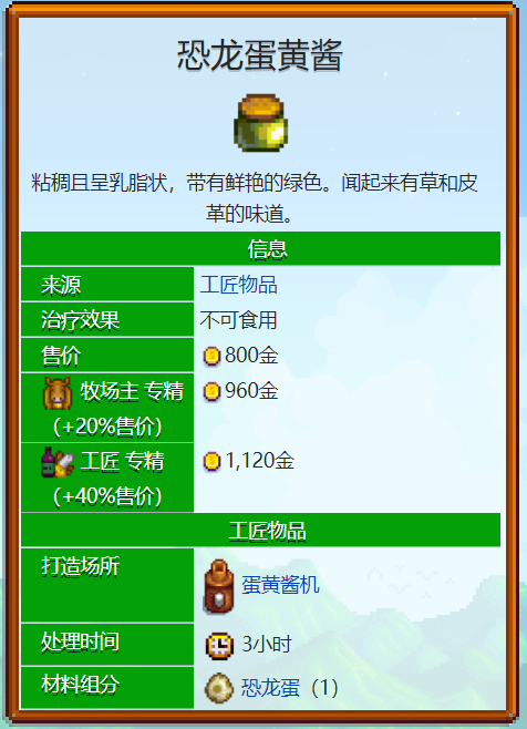 恐龙蛋黄酱:将恐龙蛋放入蛋黄酱机内制作出恐龙蛋黄酱(1.4之前制作出的是普通的蛋黄酱)。(关键词:恐龙蛋黄酱)