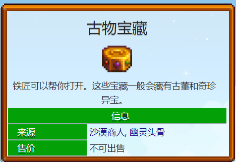 来源沙漠商人和幽灵头骨掉落。可在铁匠铺破开获得古物。
