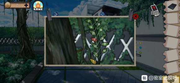 根据门左边树上的那串叶子得到密码(见下图)。叶子上的数字规律是:上面两片叶子的数字拆开单个单个的加起来等于下面叶子上的数字。例如,第一行是2+7+4+5=18,第二行是1+8+3+9=21,第三行是2+1+3+6=12,所以红叶子的数字是12。以此类推,最后一个黄叶子上的数字是7+1+9=17。