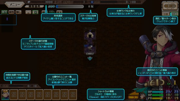 在小情报旁边的是“回到行动前”的按钮,可以回到该角色行动之前的状态,但只能返回一次,可以或用该按钮进行凹点凹装备凹素材凹卡片等一系列操作,请多多活用。Shift键可以快捷返回,space键则可以开启迷宫里的各势力表示状态。