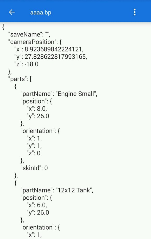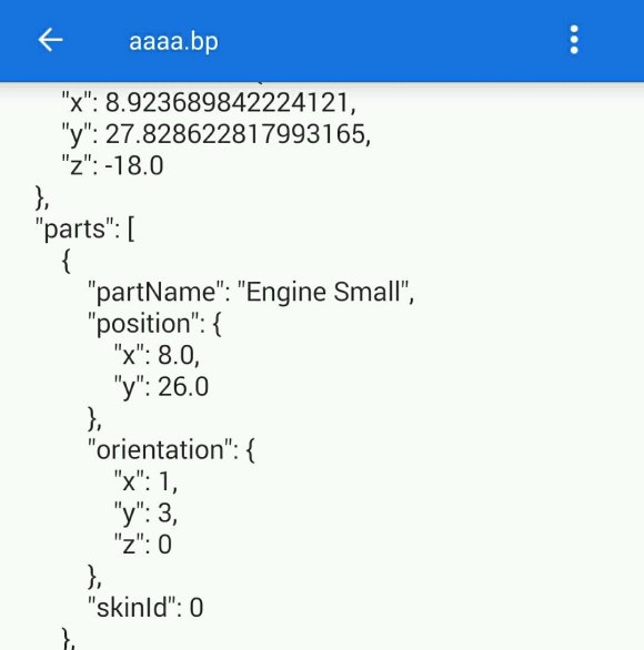这是一个4*2规格的燃料箱,「position」下面的坐标控制的是它在蓝图上的位置;「orientation」下面的千万不要看成空间直角坐标系,“x”和“y”控制的是此部件的长和宽,“z”控制的是此部件的倾斜角度;「skinld」后面的数字是燃料箱的皮肤编号,如果修改没有皮肤的零件的编号,后果不明(我也没有改过,第一个吃螃蟹的人会是谁?)。修改时要严格按照文件原来的格式,如果你不小心漏掉了一个空格,存档很可能打不开,而且这里所有的标点符号都是英文的,英文的,英文的!(重要的事情说三遍)「position」后面每一个单位长度都等于蓝图中的2格,这个坐标的叉值和歪值可以为小数(多少位的都行)。如果某个部件的位置是(5.0,4.5),改成(5.0,5.0)就是在蓝图上把这个部件向上平移1格,此平移操作不受其他部件的遮挡影响!