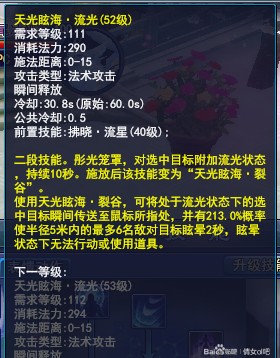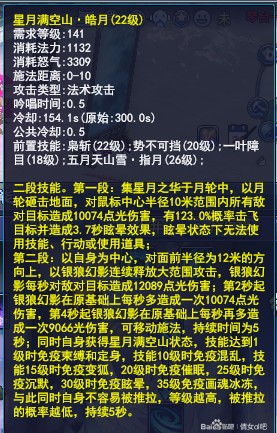 120星月满空山,这是一个2段技能,一段范围造成一次光伤害并概率击飞造成眩晕,二段大范围输出并自身获得免疫,但是129只能点10级,我切项链也才27级传家宝没有洗出,达不到30级免疫眩晕,120很酷炫伤害也可以