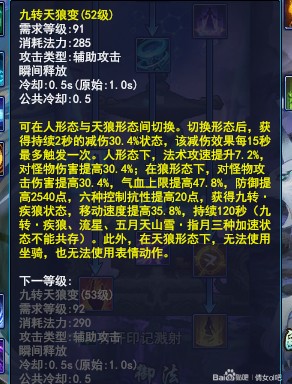 九转天狼变天狼特色技能,可人可兽,人形提升攻速(这也是倩女攻速最快的职业)和对怪物伤害(也包括BOSS)狼形提升气血防御控制抗性移动速度和对怪物伤害,天狼输出副本输出高也正是此技能在作怪