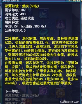 深潭如镜是天狼减伤技能129能点满,二段技能-一段降低百分比伤害,进入燃灰状态可将受到的伤害转为灰血,若五秒内没有掉血则每秒回复一定气血,二段是一个持续三秒的护甲说实话我从没用过,时间太短也并不像画魂的3秒无敌