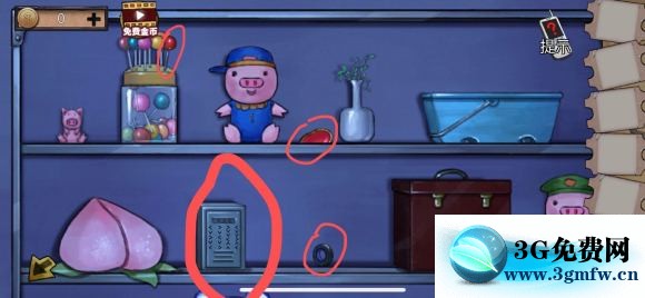 4:摇杆操纵先向上拉,抓头会变小(变小才能抓到上层物品,不拉只能抓到下层的空盒子)变小后再向右摇杆,到达标有樱桃的盒子的上方,按蓝色的抓键,抓到盒子后回到下方点开盒子,获得另外半个樱桃碎片。