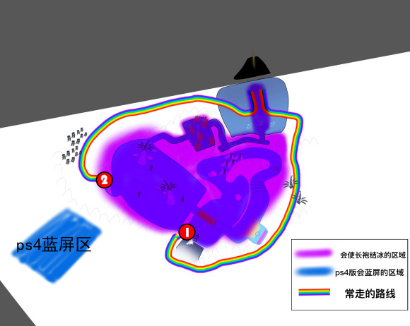 先看一下地图,用紫色涂掉的区域是会让长袍结冻导致无法飞行的区域,我画得范围不是很规范,通常就是越靠近正常游玩范围,越容易被冻住,请多加小心。