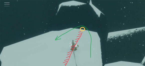 向左走了以后所有墙壁都会变成可穿透的,你不用管它们,直接落到下面的雪地上,这时候请检查一下自己是否飞行吃力,如果吃力说明又被冻住了,我们从里世界也可以回到入口的建筑内取暖。