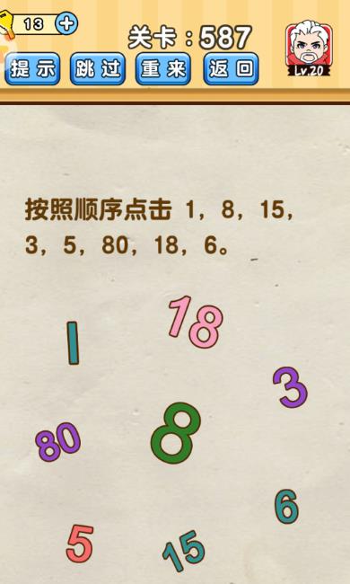 按照顺序点击是《脑洞先生》第587关的问题,很多网友不知道答案是什么,下面小编给大家带来脑洞先生第587关攻略。 问题:按照顺序点击? 答案:还是得记得数字的顺序,待会儿题目上的数字会消失。 老友网www.andlaou.com免费为你分享
