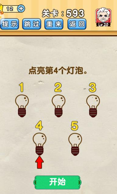 点亮第4个灯泡是《脑洞先生》第593关的问题,很多网友不知道答案是什么,下面小编给大家带来脑洞先生第593关攻略。 问题:点亮第4个灯泡? 答案:看图。 老友网www.andlaou.com免费为你分享