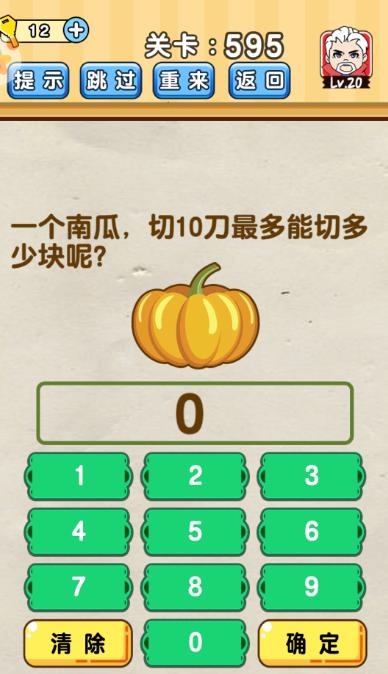 一个南瓜,切10刀最多能切多少块呢是《脑洞先生》第595关的问题,很多网友不知道答案是什么,下面小编给大家带来脑洞先生第595关攻略。 问题:一个南瓜,切10刀最多能切多少块呢? 答案:1024。 老友网www.andlaou.com免费为你分享