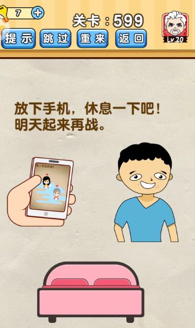 放下手机,休息一下吧,明天起来再战是《脑洞先生》第599关的问题,很多网友不知道答案是什么,下面小编给大家带来脑洞先生第599关攻略。