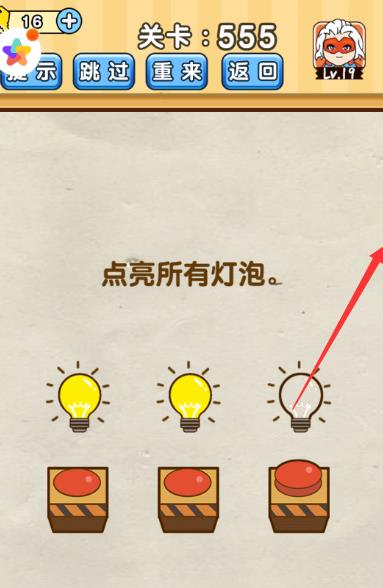 点亮所有灯泡是《脑洞先生》第555关的问题,很多网友不知道答案是什么,下面小编给大家带来脑洞先生第555关攻略。 问题:点亮所有灯泡? 答案:把不亮的灯泡拖到屏幕外。 老友网www.andlaou.com免费为你分享