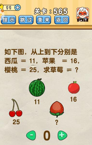 如下图,从上到下分别是西瓜=11,苹果=16,樱桃=25,求草莓=?是《脑洞先生》第565关的问题,很多网友不知道答案是什么,下面小编给大家带来脑洞先生第565关攻略。