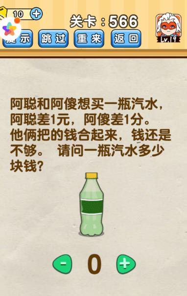 阿聪和阿傻想买一瓶汽水,阿聪差1元,阿傻差1分。他俩把的钱合起来,钱还是不够。请问一瓶汽水多少块钱?是《脑洞先生》第566关的问题,很多网友不知道答案是什么,下面小编给大家带来脑洞先生第566关攻略。