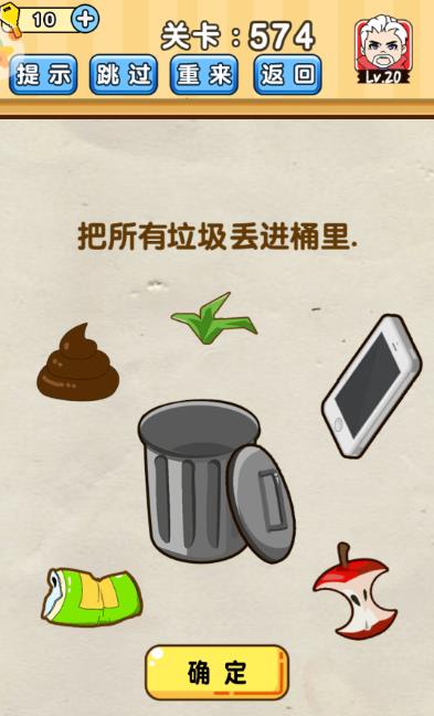 把所有垃圾丢进桶里是《脑洞先生》第574关的问题,很多网友不知道答案是什么,下面小编给大家带来脑洞先生第574关攻略。 问题:把所有垃圾丢进桶里? 答案:注意手机不是垃圾哦。 老友网www.andlaou.com免费为你分享
