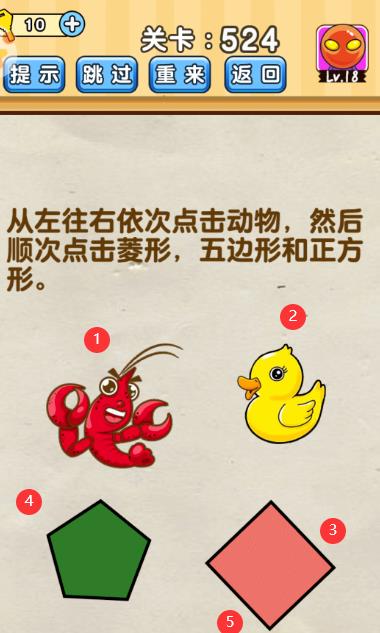 从左往右依次点击动物,然后点击菱形,五边形和正方形是《脑洞先生》第524关的问题,很多网友不知道答案是什么,下面小编给大家带来脑洞先生第524关攻略。