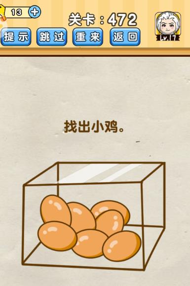 找出小鸡是《脑洞先生》第472关的问题,很多网友不知道答案是什么,下面小编给大家带来脑洞先生第472关攻略。 问题:找出小鸡? 答案:摇晃手机,鸡蛋相碰,壳碎了,小鸡就出来了。 老友网www.andlaou.com免费为你分享