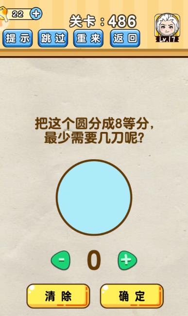 把这个圆分成8等分,最少需要几刀呢是《脑洞先生》第486关的问题,很多网友不知道答案是什么,下面小编给大家带来脑洞先生第486关攻略。 问题:把这个圆分成8等分,最少需要几刀呢? 答案:1。 老友网www.andlaou.com免费为你分享