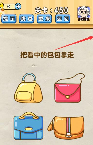 把看中的包包拿走是《脑洞先生》第450关的问题,很多网友不知道答案是什么,下面小编给大家带来脑洞先生第450关攻略。 问题:把看中的包包拿走? 答案:是“包包”这两个字。 老友网www.andlaou.com免费为你分享