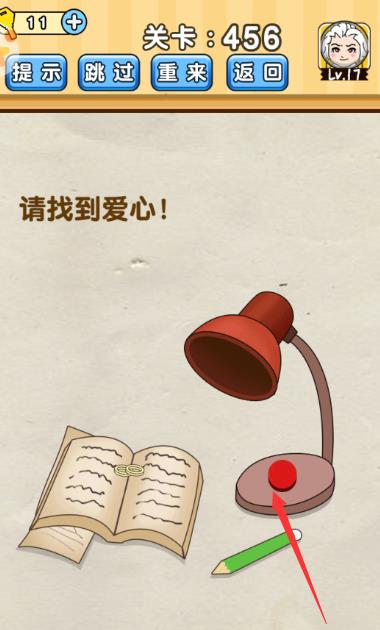 请找到爱心是《脑洞先生》第456关的问题,很多网友不知道答案是什么,下面小编给大家带来脑洞先生第456关攻略。 问题:请找到爱心? 答案:点击台灯开关,就能在灯光的照射下,两个戒指的影子就是爱心啦。 老友网www.andlaou.com免费为你分享