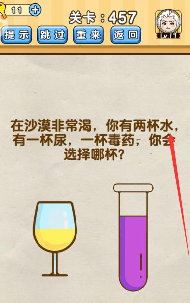 在沙漠非常渴,你有两杯水,有一杯尿,一杯毒药,你会选择哪杯是《脑洞先生》第457关的问题,很多网友不知道答案是什么,下面小编给大家带来脑洞先生第457关攻略。