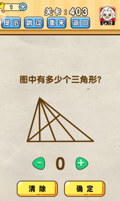 图中有多少个三角形是《脑洞先生》第403关的问题,很多网友不知道答案是什么,下面小编给大家带来脑洞先生第403关攻略。 问题:图中有多少个三角形? 答案:20。 老友网www.andlaou.com免费为你分享