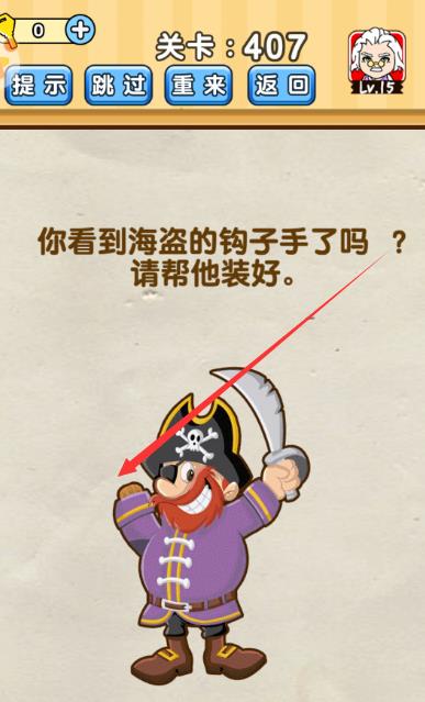 你看到海盗的钩子手了吗?请帮他装好是《脑洞先生》第407关的问题,很多网友不知道答案是什么,下面小编给大家带来脑洞先生第407关攻略。