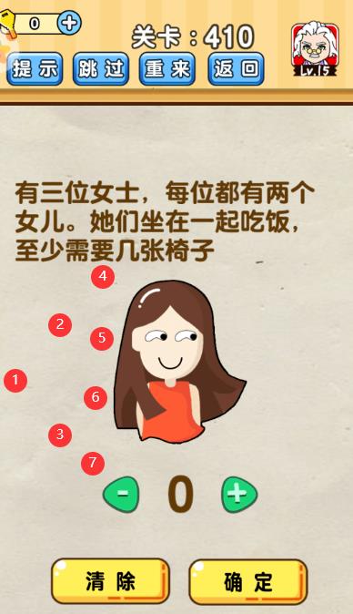有三位女士,每位都有两个女儿,她们坐在一起吃饭,至少需要几张椅子是《脑洞先生》第410关的问题,很多网友不知道答案是什么,下面小编给大家带来脑洞先生第410关攻略。