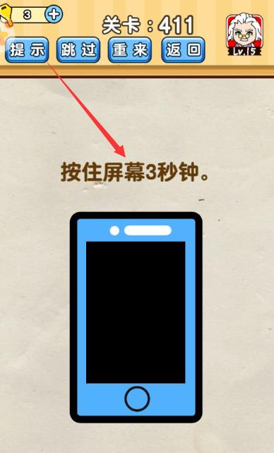 按住屏幕3秒钟是《脑洞先生》第411关的问题,很多网友不知道答案是什么,下面小编给大家带来脑洞先生第411关攻略。 问题:按住屏幕3秒钟? 答案:是“屏幕”两个字,不是下面的手机。 老友网www.andlaou.com免费为你分享