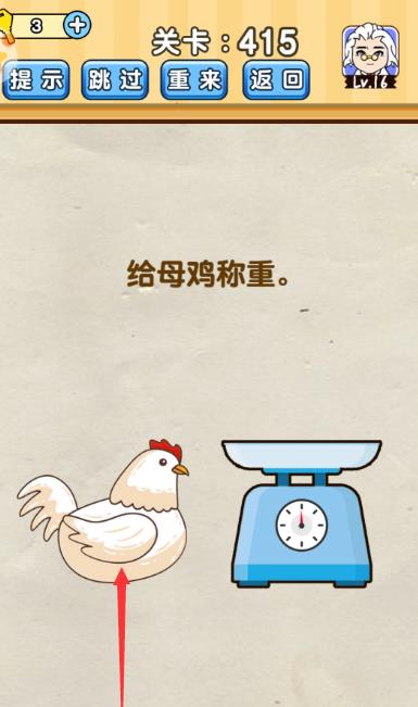 给母鸡称重是《脑洞先生》第415关的问题,很多网友不知道答案是什么,下面小编给大家带来脑洞先生第415关攻略。