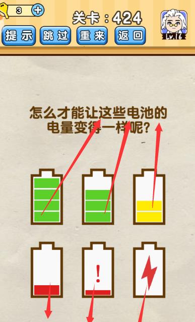怎么才能让这些电池的电量变得一样呢是《脑洞先生》第424关的问题,很多网友不知道答案是什么,下面小编给大家带来脑洞先生第424关攻略。