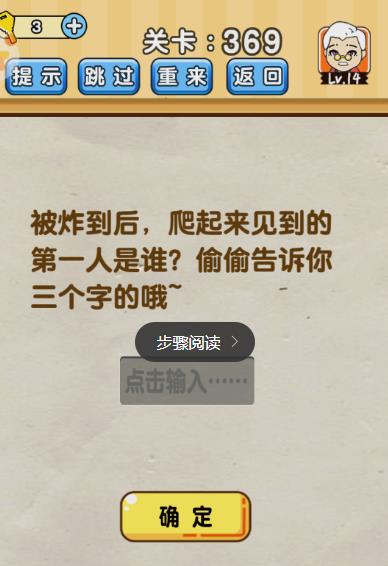 被炸到后,爬起来见到的第一个人是谁?偷偷告诉你三个字的哦是《脑洞先生》第369关的问题,很多网友不知道答案是什么,下面小编给大家带来脑洞先生第369关攻略。