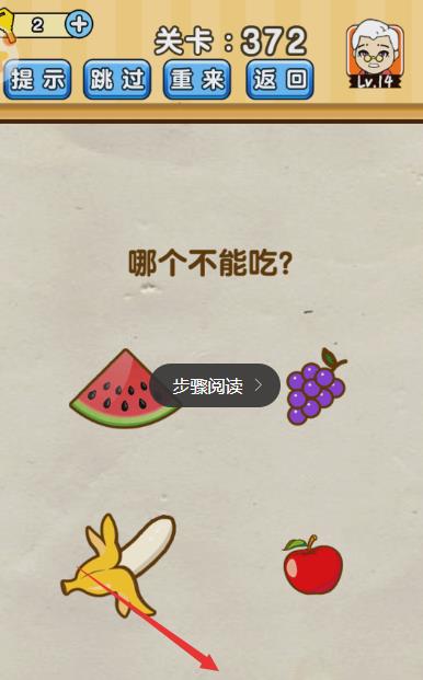 哪个不能吃是《脑洞先生》第372关的问题,很多网友不知道答案是什么,下面小编给大家带来脑洞先生第372关攻略。 问题:哪个不能吃? 答案:带着香蕉皮的香蕉不能吃,把香蕉皮拿掉即可。 老友网www.andlaou.com免费为你分享