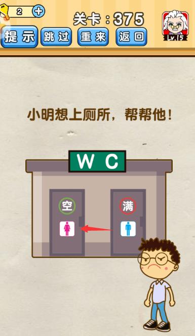 小明想上厕所,帮帮他是《脑洞先生》第375关的问题,很多网友不知道答案是什么,下面小编给大家带来脑洞先生第375关攻略。 问题:小明想上厕所,帮帮他? 答案:把男女厕所的标志换一下即可。 老友网www.andlaou.com免费为你分享