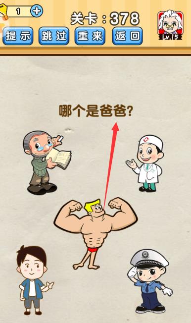 哪个是爸爸是《脑洞先生》第378关的问题,很多网友不知道答案是什么,下面小编给大家带来脑洞先生第378关攻略。 问题:哪个是爸爸? 答案:别乱认,点击“爸爸”两个字即可。 老友网www.andlaou.com免费为你分享