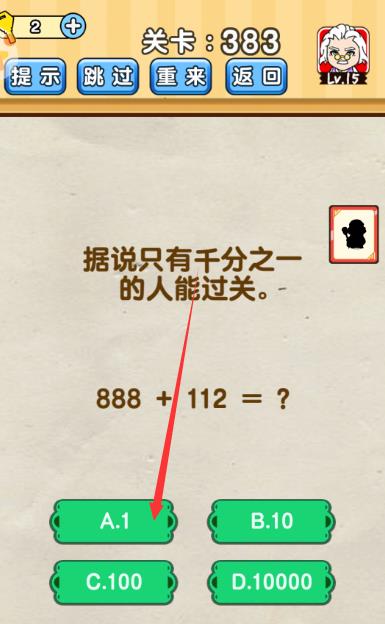所说只有千分之一的人能过关,888+112=?是《脑洞先生》第383关的问题,很多网友不知道答案是什么,下面小编给大家带来脑洞先生第383关攻略。