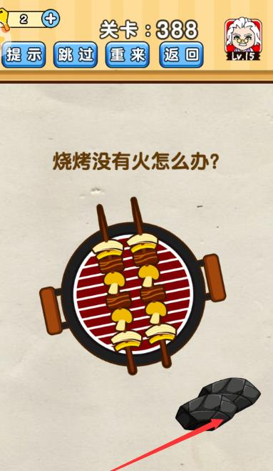 烧烤没有火怎么办是《脑洞先生》第388关的问题,很多网友不知道答案是什么,下面小编给大家带来脑洞先生第388关攻略。 问题:烧烤没有火怎么办? 答案:摩擦旁边的火石即可,因为摩擦生热。 老友网www.andlaou.com免费为你分享