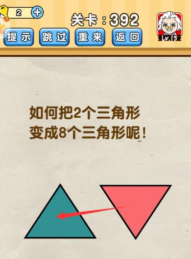 如何把2个三角形变成8个三角形呢是《脑洞先生》第392关的问题,很多网友不知道答案是什么,下面小编给大家带来脑洞先生第392关攻略。