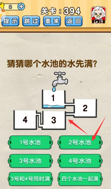 猜猜哪个水池的水先满是《脑洞先生》第394关的问题,很多网友不知道答案是什么,下面小编给大家带来脑洞先生第394关攻略。 问题:猜猜哪个水池的水先满? 答案:2号,因为2号跟3号之间被堵住了。 老友网www.andlaou.com免费为你分享