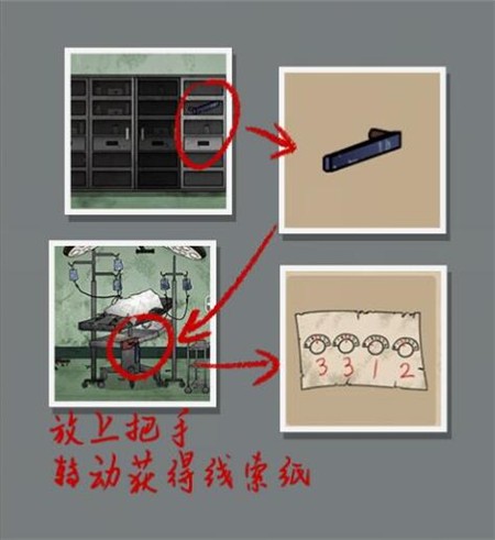 去柜子处拿到床把手,装到床上,装动2次,获得一张线索纸。