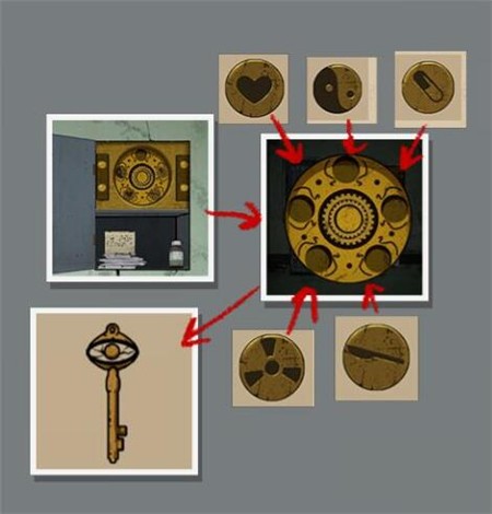 将5个金属片放到墙壁的机关里,打开机关,获得办公室钥匙。