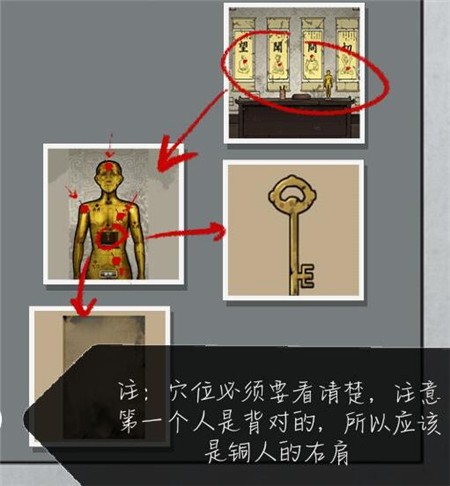 依次按照正确的穴位插入银针,打开铜人机关,获得中药室钥匙和羊皮纸。