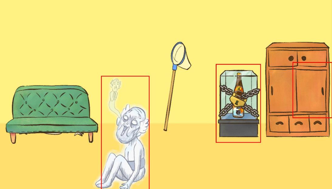 点击木橱柜的中间层右边门,收集医药箱,用医药箱砸开放酒的玻璃柜,把酒给爷爷喝。