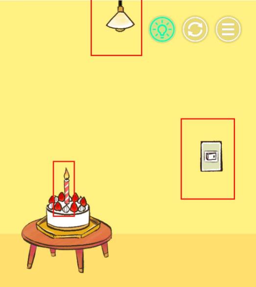 收集蛋糕上的蜡烛,点击开关关灯,用蜡烛照亮顶部灯的位置。