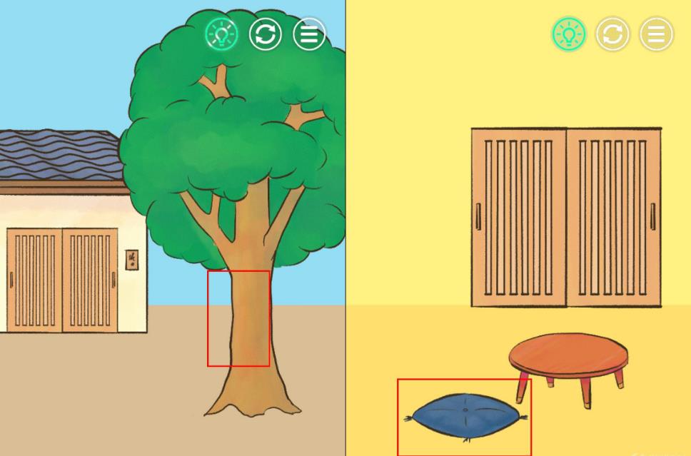 点击房子进入房子,收集茶几旁的坐垫,点击房门出门,拖动坐垫至树杆上。