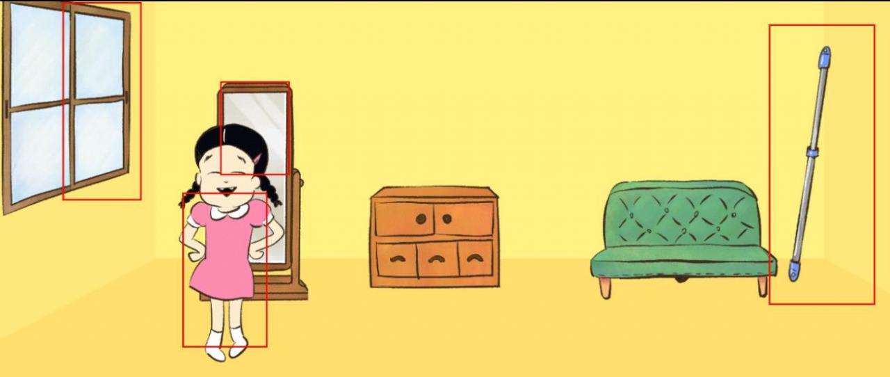 收集杆子,打开窗户,使用杆子把裙子?拿过来,把裙子?给前面的小红(妹妹)穿上,点击镜子。